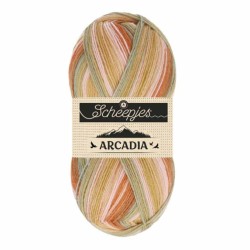 Vydajte sa na dobrodružstvo so Scheepjes Arcadia! Scheepjes Arcadia je nádherná ponožková priadza inšpirovaná pôsobivými krajinami z celého sveta. Je to priadza odolná voči opotrebovaniu vyrobená zo 75% panenskej vlny Superwash a 25% polyamidu v pásikavých farebných prevedeniach aj v plných farbách. Priadza je hrejivá, no stále má priedušnú kvalitu vlny. Vďaka polyamidovému komponentu je odolná voči opotrebovaniu a ľahko sa udržiava. Arcadia na dotyk pôsobí jemne rustikálne, ale počas používania zmäkne. Kolekcia Scheepjes Arcadia ponúka pruhované aj plné farby, čo poskytuje množstvo možností na vytvorenie vlastných pletených ponožiek. Môžete napríklad upliesť pruhovanú ponožku s pätou a špičkou v pevných odtieňoch. Arcadia je samozrejme vhodná aj na všetky druhy oblečenia a doplnkov, ako sú svetre a šály.